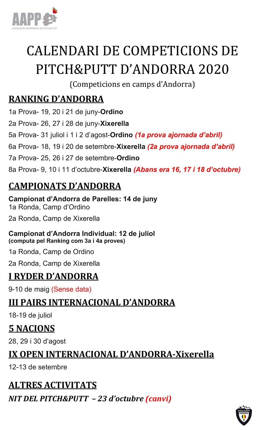 Les actuaitzacions afecten a les proves pendents del Ranquing d'Andorra (proves 6, 7 i 8) i a la data de celebració de la Nit del Pitch&Putt.