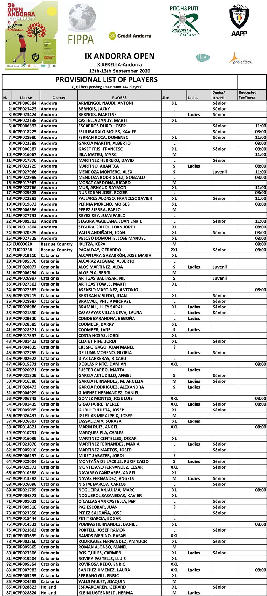A continuació trobareu la llista provisional de preinscits a l'Open. Amb l'objectiu d'organitzar millor l'Open Internacional del 2020 a Xixerella, el Comité Organitzador va establir una data de PREINSCRIPCIÓ PRELIMINAR FINS L'11 D'AGOST DE 2020. La data de tancament definitiu de les inscripcions és el dia 25 d'agost.